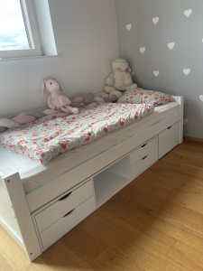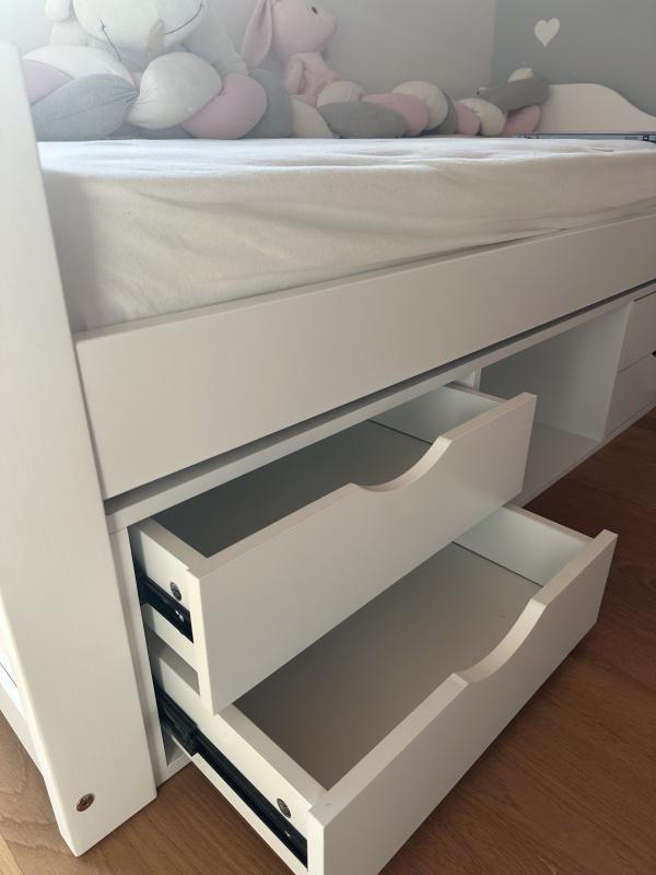 Njena največja prednost so prostorni predali pod posteljo, ki ponujajo dodatni prostor za shranjevanje. V njih lahko pospravite posteljnino, igrače, knjige ali oblačila – kar je še posebej praktično v otroških sobah, kjer pogosto primanjkuje prostora.