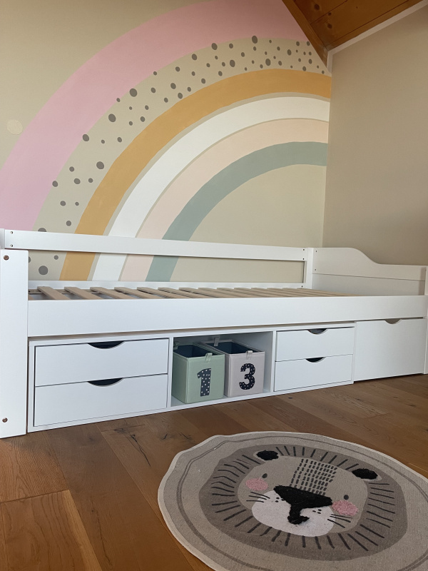 Zaradi minimalističnega belega dizajna se postelja lepo poda v sodobne otroške in mladinske sobe, hkrati pa ustvarja urejen in prijeten prostor za spanje.